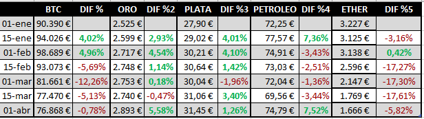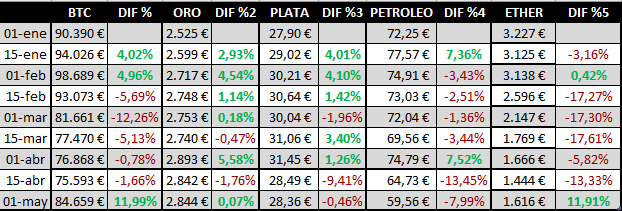 Llegado el 1 de mayo vemos como el BTC sube y el petroleo sigue su bajada, recordar que hacemos seguimiento con la hora de referencia 12:00 CET y la diferencia en % con el día anterior: