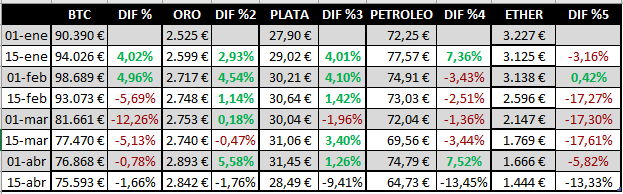 Vamos a realizar un seguimiento de las materias primas/cryptos mas importantes/relevantes como si hiciéramos una inversión recurrente de 50€ cada 15 días. Partiendo desde el de 1 de enero de 2025