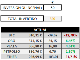 Inversión quincenal de 50€, a día de hoy llevaríamos 350€ con cada una de la materias /cryptos, siguiendo la fila seria lo que tendríamos actualmente si retirásemos lo invertido cada 15 dias (los 350€ actuales), la diferencia con lo invertido ( 350€ actualmente) y la diferencia en porcentaje.
