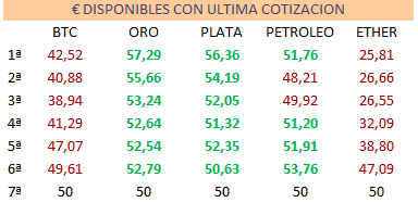 De los primeros 50€ invertidos en btc, a fecha de 1 de abril (ultima inversión realizada) tendríamos 42.52€, de la segunda inversión de 50€ tendríamos 40.88€ y así con todas las demás, teniendo en cuenta siempre que es lo que tendríamos según el valor de la cotización en la ultima compra, siendo el oro y la plata las únicas 100% rentables en cada compra quincenal desde el inicio de año